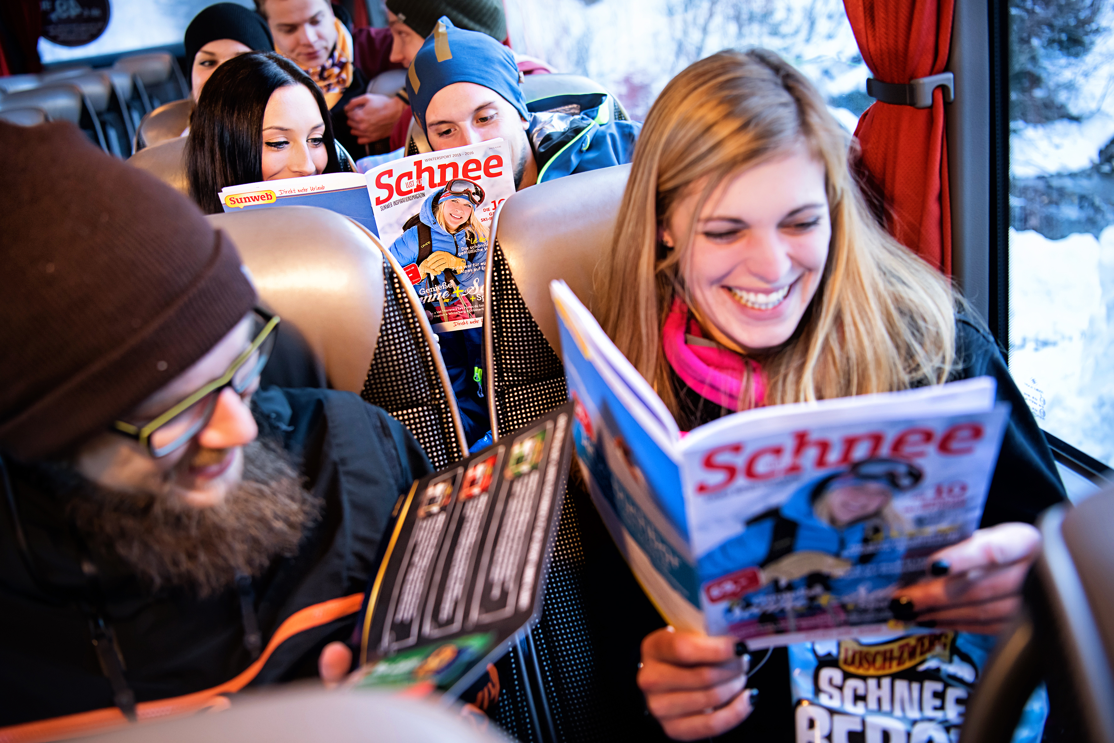 - Abfahrt ins Skigebiet in modernen Reisebussen